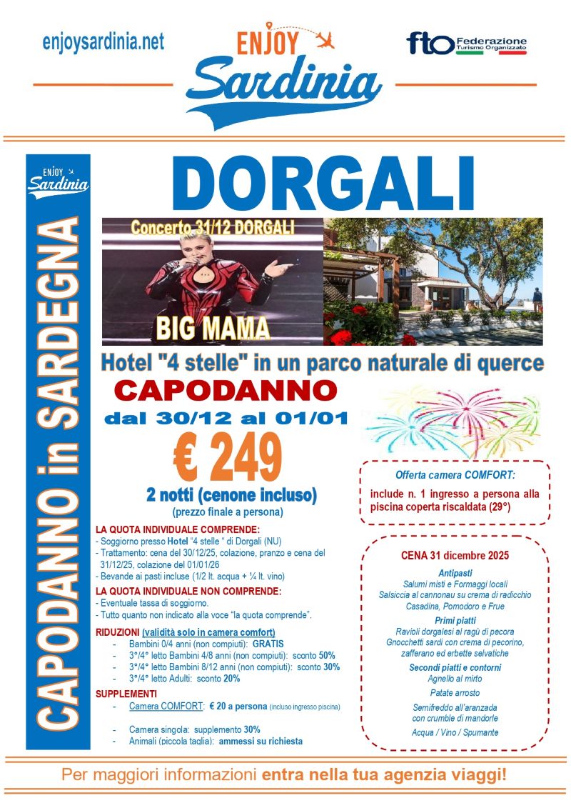 Capodanno DORGALI, 2 notti, cenone incluso, concerto "Big Mama"