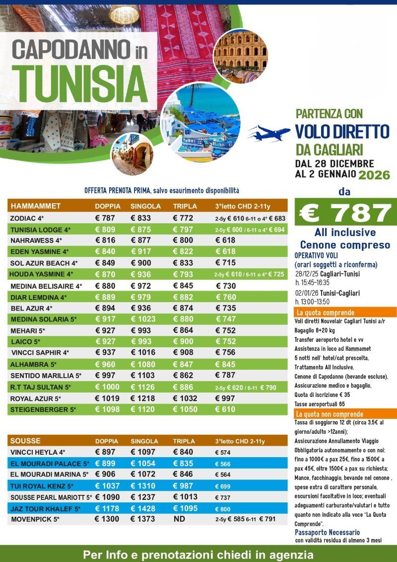 ASPeriodo: CAPODANNO, DicembrePartenza da: Aeroporto di CagliariTrattamento: All InclusivePeriodo: dal 28/12/2025 al 02/01/2026Notti: 6 giorni / 5 nottiHotel: Hotel cat. 4 stelle / 5 stelle